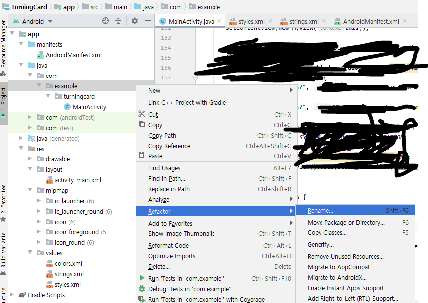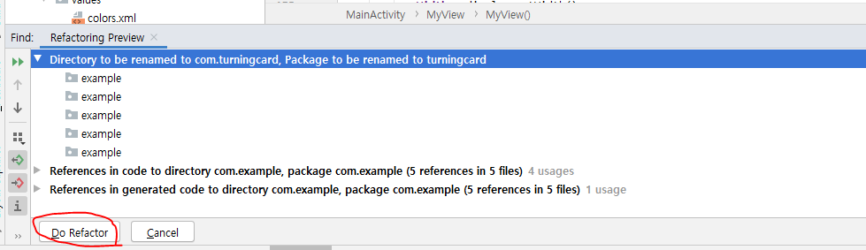 5. 패키지명을 변경 후 안드로이드 스튜디오 하단에 표시되어 있는 Do Refactor을 클릭해야 설정이 변경 됨