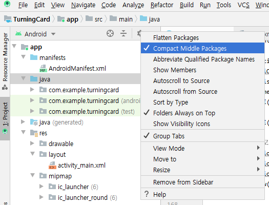 1. 패키지명을 바꿀 폴더에서 오른쪽 상단의 톱니바퀴를 클릭 후 Compact Middle Packages를 클릭한다.