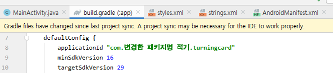 6. 마지막으로 Gradle Scripts폴더의 build gradle(Module : app)을 들어간 후 아래 사진처럼 변경한 패키지명을 적으면 끝!!!